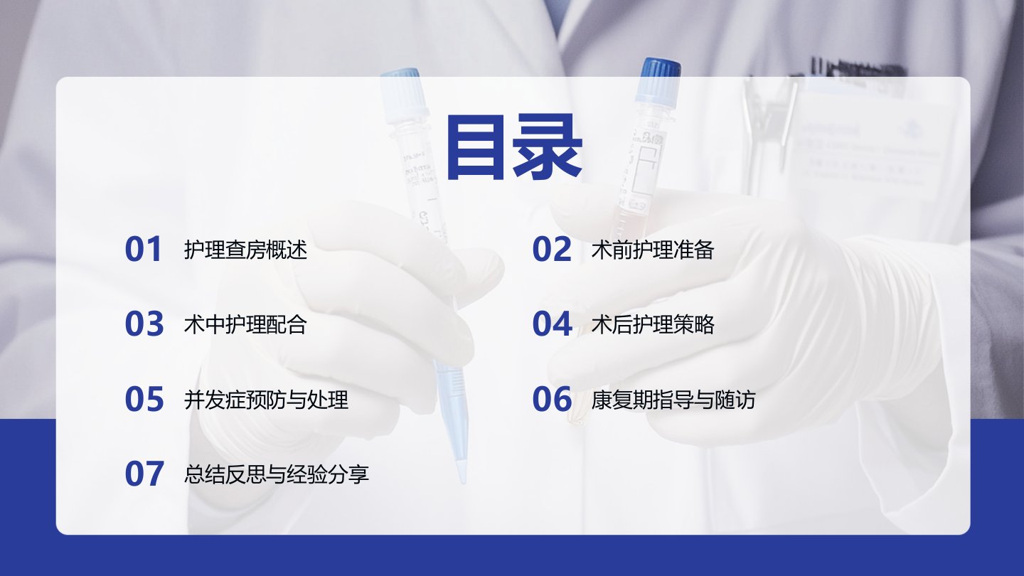 胸腔镜肺癌根治术护理查房精准护理,助力患者康复汇报人:目录护理查房概述01术前护理准备02术中护理配合03术后护理策略04并发症预防与处理05康复期指导与随访06总结反思与经验分享07护理查房概述01查房目的与流程查房目的与价值护理查房通过系统评估患者术后恢复指标,包括生命体征、疼痛管理及心理干预,为优化护理方案提供数据支撑,确保医疗质量持续提升。标准化查房流程从患者信息核验到症状评估,严格执行分阶段查房流程,重点关注肺功能康复及心理状态监测,实现全流程精细化护理管理。核心查房要素围绕体征监测、并发症防控等关键环节,强化呼吸功能恢复跟踪与记录,确保护理措施精准有效,推动护理服务标准化建设。查房...