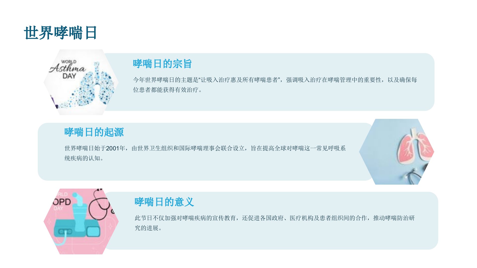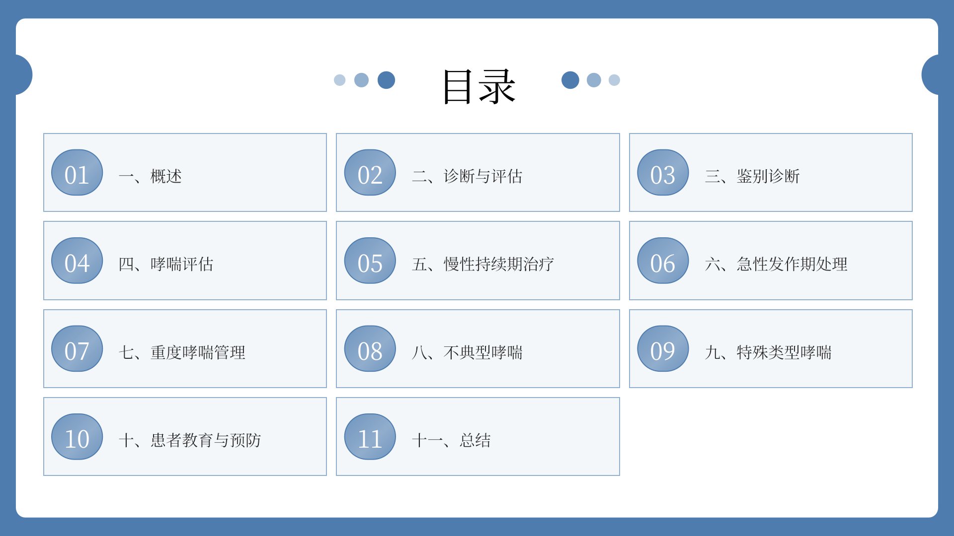 支气管哮喘防治指南(2025年版)今年世界哮喘日的主题是“让吸入治疗惠及所有哮喘患者”,强调吸入治疗在哮喘管理中的重要性,以及确保每位患者都能获得有效治疗。世界哮喘日哮喘日的宗旨世界哮喘日始于2001年,由世界卫生组织和国际哮喘理事会联合设立,旨在提高全球对哮喘这一常见呼吸系统疾病的认知。哮喘日的起源此节日不仅加强对哮喘疾病的宣传教育,还促进各国政府、医疗机构及患者组织间的合作,推动哮喘防治研究的进展。哮喘日的意义一、概述01二、诊断与评估02三、鉴别诊断03四、哮喘评估04五、慢性持续期治疗05六、急性发作期处理06七、重度哮喘管理07八、不典型哮喘08九、特殊类型哮喘09十、患者教育与预防...