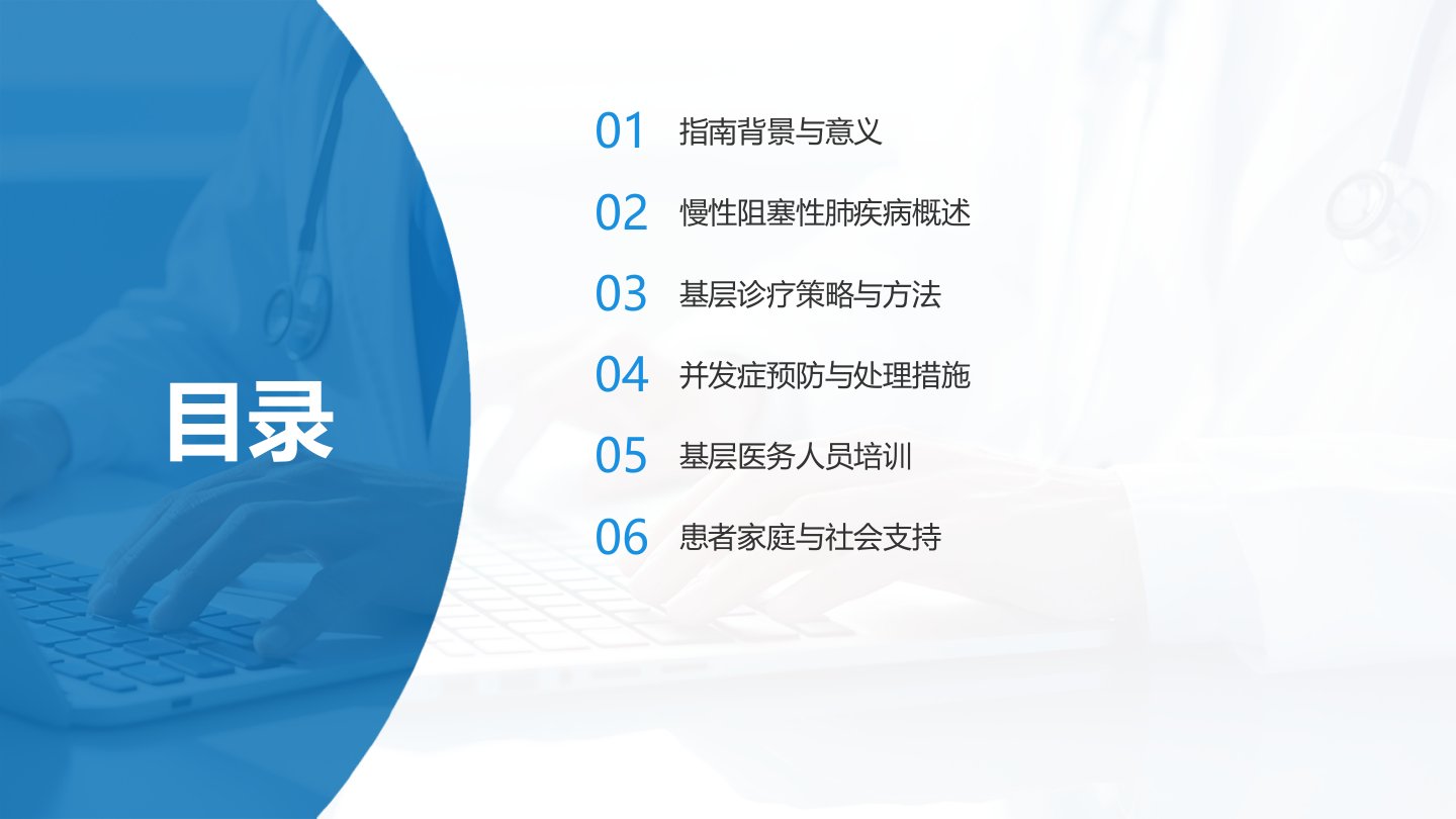 中国慢性阻塞性肺疾病基层诊疗与管理指南2024解读助力基层医疗,提升慢阻肺管理水平汇报人:目录指南背景与意义01慢性阻塞性肺疾病概述02基层诊疗策略与方法03并发症预防与处理措施04基层医务人员培训05患者家庭与社会支持0601指南背景与意义发布背景慢性阻塞性肺疾病现状慢性阻塞性肺疾病作为一种常见且多发的呼吸系统疾病,其患病率与年龄增长呈正相关,给中老年群体的健康带来了严重威胁,同时也加重了医疗系统的负担。随着医学研究的深入和临床治疗技术的进步,对慢性阻塞性肺疾病的理解和管理策略不断优化,因此,定期更新基层诊疗与管理指南成为提高治疗效果的关键步骤。基层医疗机构的作用基层医疗机构在慢性阻塞性肺疾...