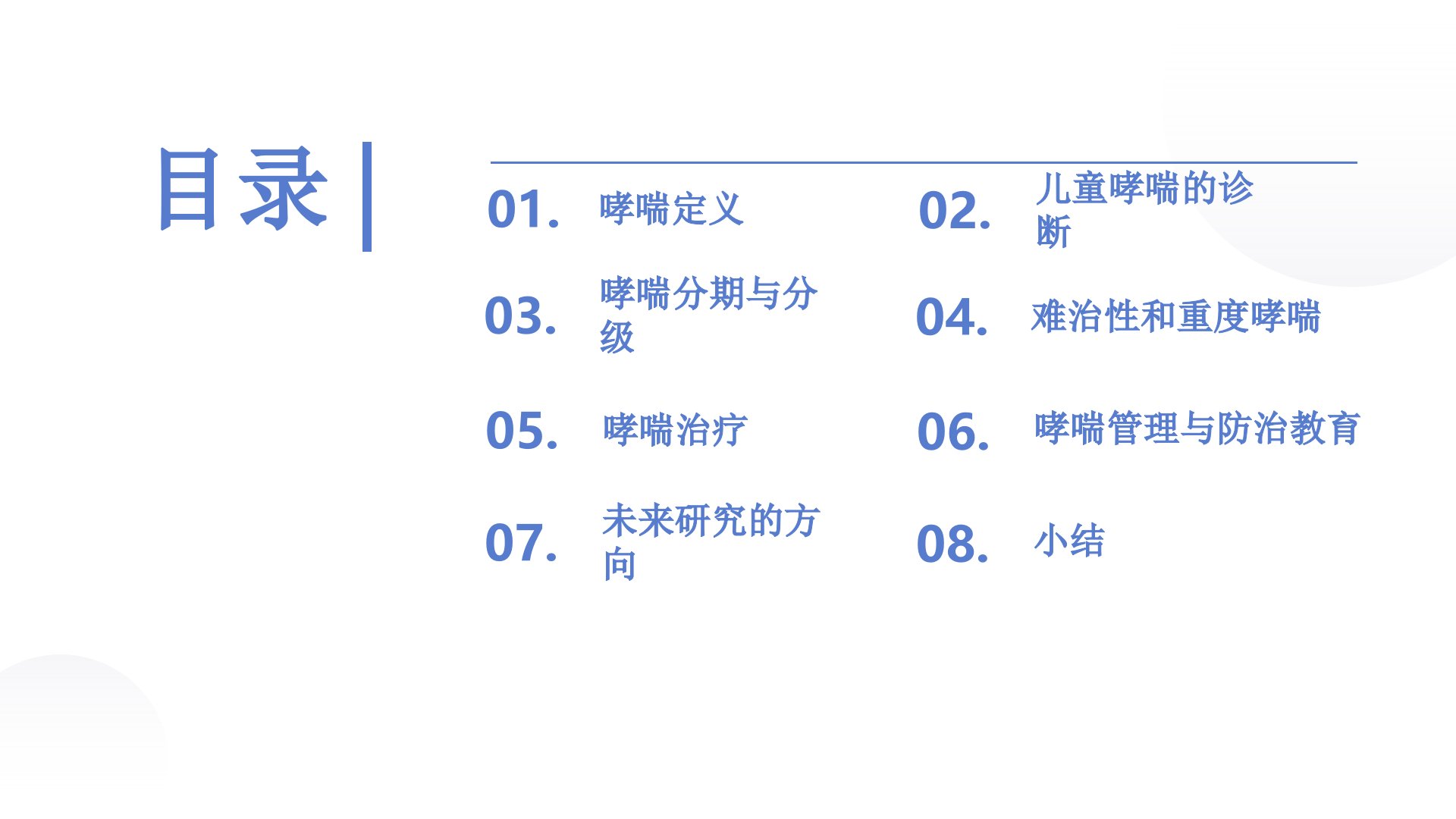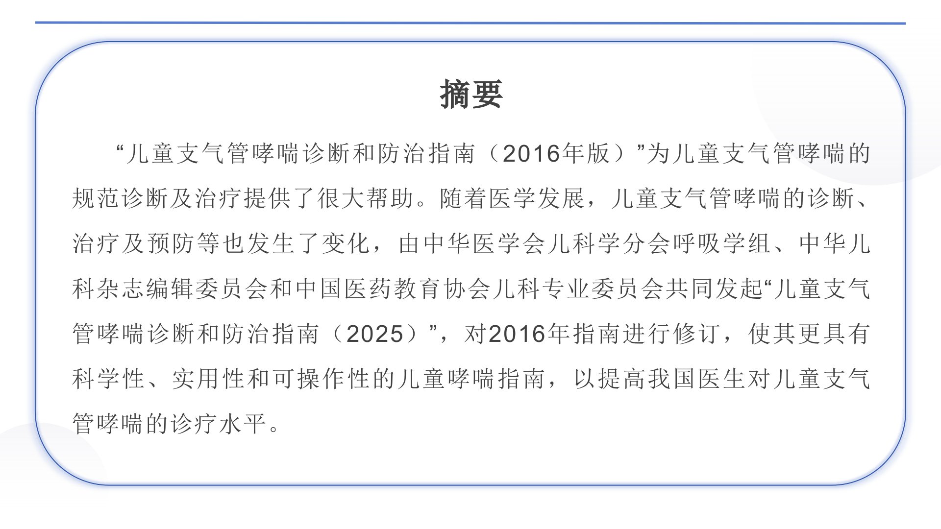 儿童支气管哮喘诊断与防治指南(2025)汇报人目录01.哮喘定义02.儿童哮喘的诊断03.哮喘分期与分级04.难治性和重度哮喘05.哮喘治疗06.哮喘管理与防治教育07.未来研究的方向08.小结摘要“儿童支气管哮喘诊断和防治指南(2016年版)”为儿童支气管哮喘的规范诊断及治疗提供了很大帮助。随着医学发展,儿童支气管哮喘的诊断、治疗及预防等也发生了变化,由中华医学会儿科学分会呼吸学组、中华儿科杂志编辑委员会和中国医药教育协会儿科专业委员会共同发起“儿童支气管哮喘诊断和防治指南(2025)”,对2016年指南进行修订,使其更具有科学性、实用性和可操作性的儿童哮喘指南,以提高我国医生对儿童支气管哮...
