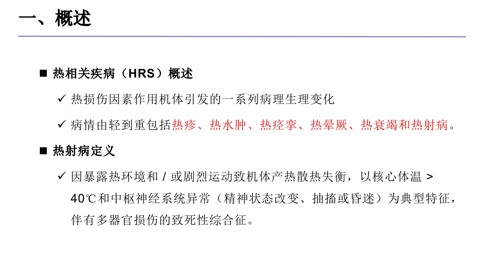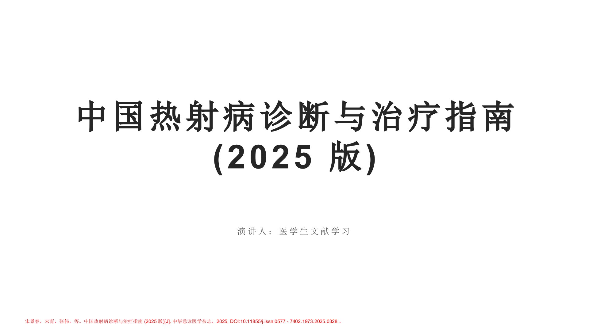中国热射病诊断与治疗指南(2025版)演讲人:医学生文献学习宋景春,宋青,张伟,等。中国热射病诊断与治疗指南(2025版)[J].中华急诊医学杂志,2025,DOI:10.11855/j.issn.0577-7402.1973.2025.0328。分型01一、概述热相关疾病(HRS)概述热损伤因素作用机体引发的一系列病理生理变化病情由轻到重包括热疹、热水肿、热痉挛、热晕厥、热衰竭和热射病。热射病定义因暴露热环境和/或剧烈运动致机体产热散热失衡,以核心体温>40℃和中枢神经系统异常(精神状态改变、抽搐或昏迷)为典型特征,伴有多器官损伤的致死性综合征。一、概述二、热射病分型经典型热射病(...