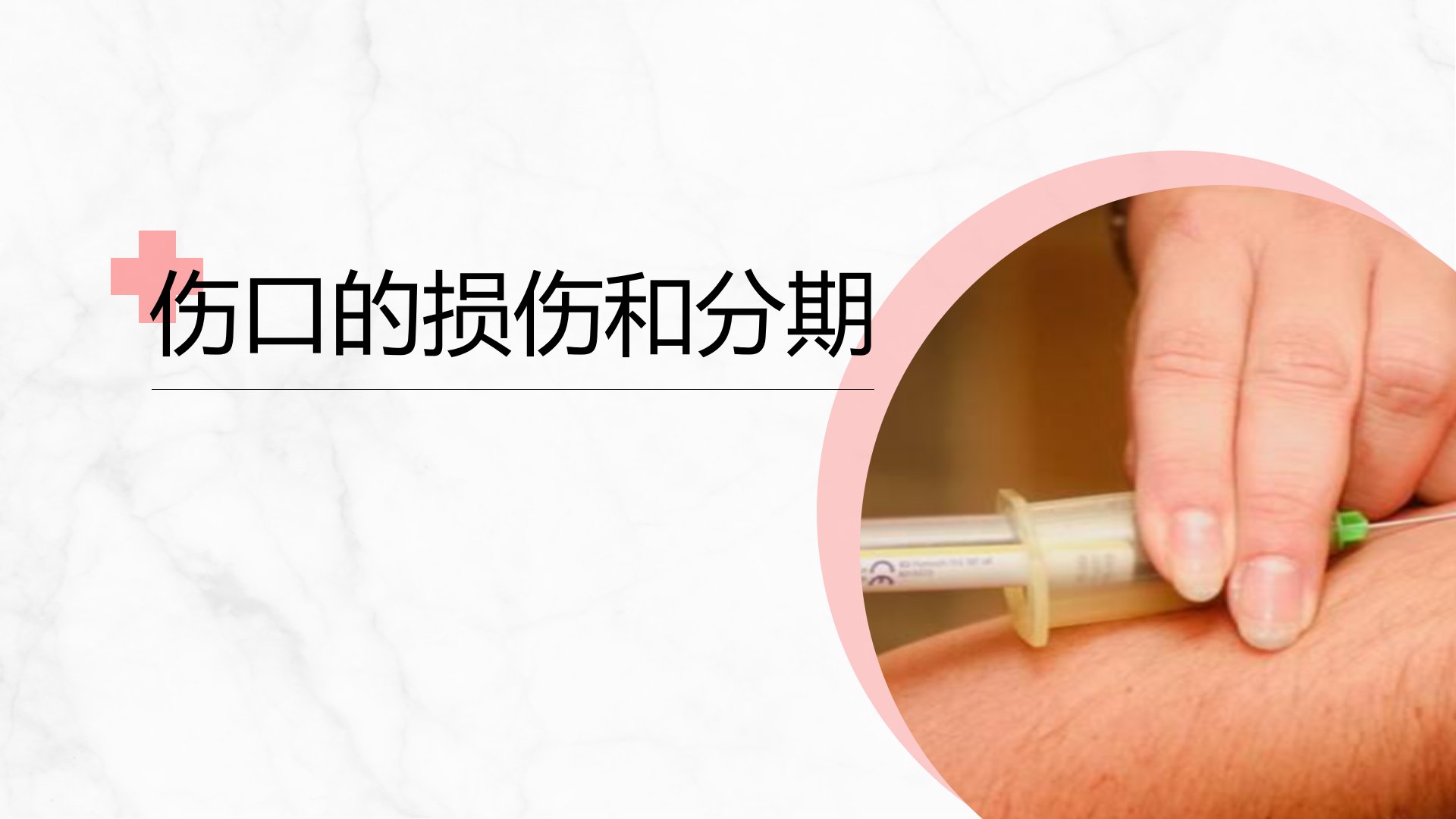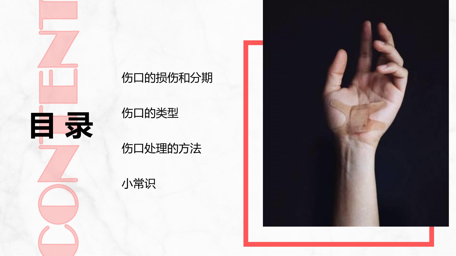 伤口处理护理CONTENT目录伤口的损伤和分期伤口的类型伤口处理的方法小常识伤口的损伤和分期伤口正常皮肤组织在外界致伤因子的作用下所致的损害,皮肤完整性遭到破坏,伴有一定量正常组织的丢失;同时,皮肤的正常功能受损。复合伤口皮肤完整性受损,并累及肌肉,骨骼及内部器官的深伤口什么是伤口?伤口愈合的过程1-3年3个阶段到伤口疤痕的平滑及回复组织最大韧度,伤口愈合的过程可为1-3年。可按时间先后发生分为三个阶段,但事实上每一个阶段的发生都是彼此重叠的,难以清楚地区分伤口愈合过程为三个独立的阶段。炎性反应期肉芽期上皮期伤口反应直到3-4天第1-14天第3-4天到第21天伤口愈合的分期清创期(炎性反应期)...