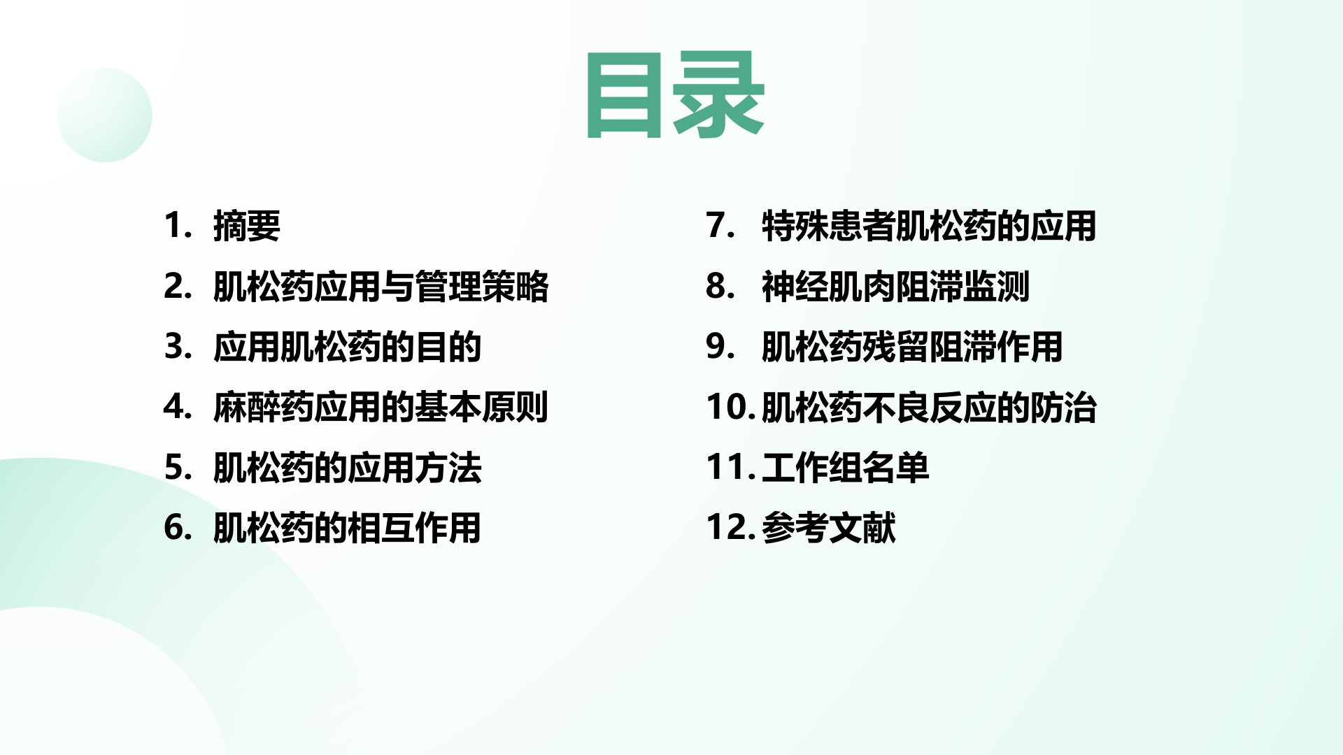 骨骼肌松弛药临床应用专家共识(2024)汇报人:郭麻笔记2025-04-11摘要肌松药应用与管理策略应用肌松药的目的麻醉药应用的基本原则肌松药的应用方法肌松药的相互作用目录特殊患者肌松药的应用神经肌肉阻滞监测肌松药残留阻滞作用肌松药不良反应的防治工作组名单参考文献摘要PARTONE摘要骨骼肌松弛药是常用药物,全身麻醉手术中合理应用骨骼肌松弛药和神经肌肉阻滞拮抗药,及时进行神经肌肉阻滞监测,能为患者提供有效的安全保障。麻醉手术肌松药01关于骨骼肌松弛药、神经肌肉阻滞拮抗药、新型神经肌肉阻滞监测设备等的研究内容不断扩充更新,为肌肉松弛药的应用提供了更多选择和依据。肌松药研究新进展02文章参考国内外...