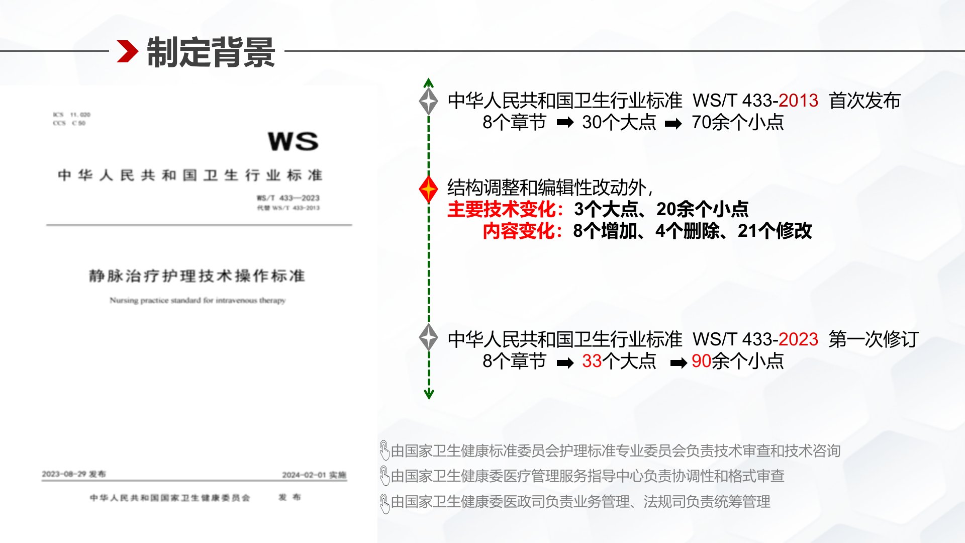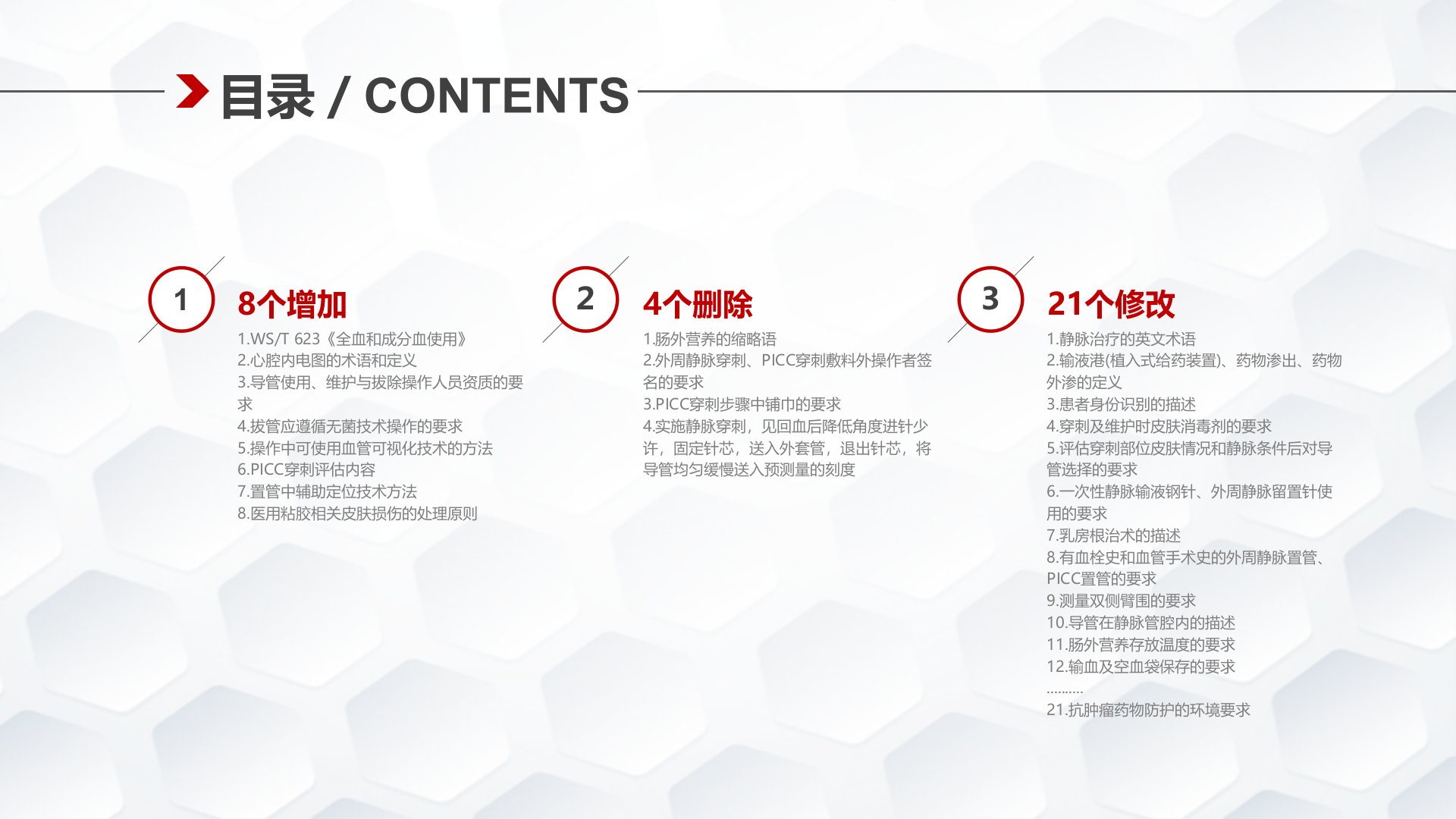 静脉治疗护理技术操作标准解读中华人民共和国卫生行业标准【2024-02-01实施】目录/CONTENTS在规范性引用文件中,增加了WS/T623《全血和成分血使用》(见第2章)心腔内电图的术语和定义(见3.10)导管使用、维护与拔除操作人员资质的要求(见5.4)拔管应遵循无菌技术操作的要求(见6.1.4)操作中可使用血管可视化技术的方法(见6.1.11)PICC穿刺评估内容(见6.3.2.1a),6.3.2.1c))增加了WS/T623《全血和成分血使用》输血前:1.应了解患者血型、输血史及不良反应史。2.和床旁输血时应分别双人核对输血信息,无误后才可输注。输液(血)器及输液附加装置的使用1....