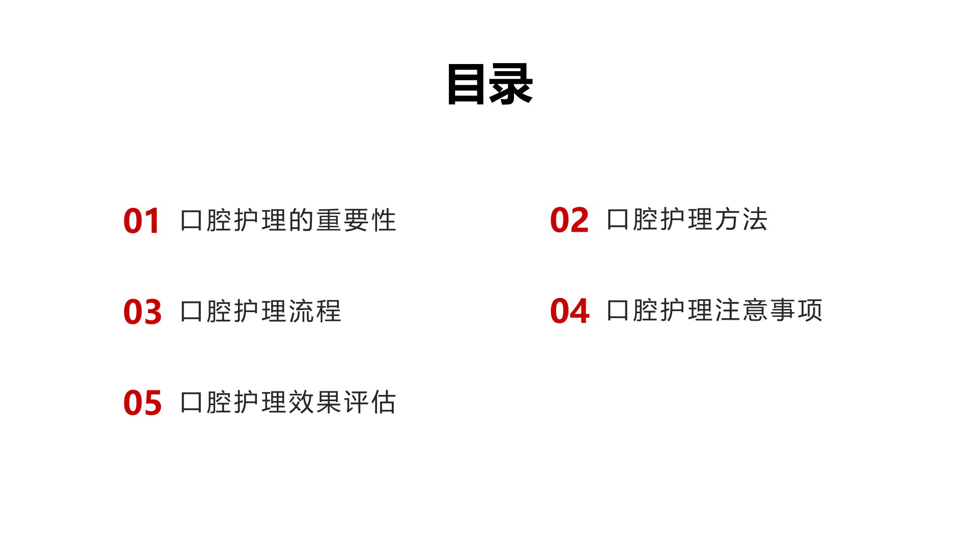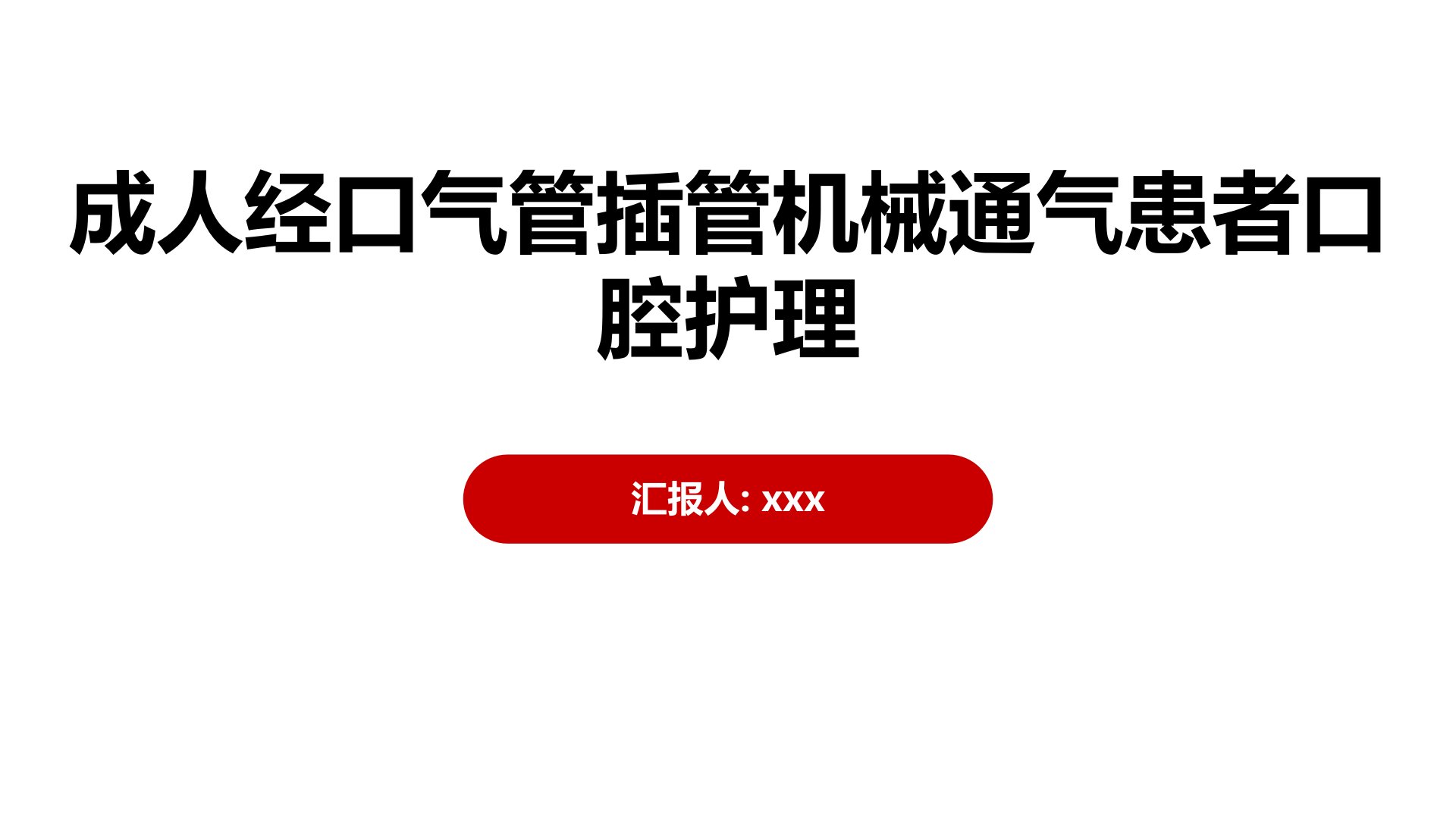成人经口气管插管机械通气患者口腔护理汇报人:xxx01口腔护理的重要性02口腔护理方法03口腔护理流程04口腔护理注意事项05口腔护理效果评估目录口腔护理的重要性01减少细菌滋生评估口腔pH值去除口腔残留物保持口腔湿润定期清洁口腔,可以有效减少细菌滋生,预防呼吸机相关性肺炎。使用湿化器和口腔保湿剂,维持口腔湿润,防止口腔黏膜干燥和裂伤。及时清除口腔内的食物残渣和分泌物,避免形成细菌培养基,降低感染风险。定期监测口腔pH值,调整口腔护理方案,以维持口腔环境的酸碱平衡,预防感染。预防口腔感染预防呼吸机相关性肺炎定期口腔护理可减少细菌滋生,降低呼吸机相关性肺炎的风险。保持呼吸道通畅清洁口腔可避免分泌...