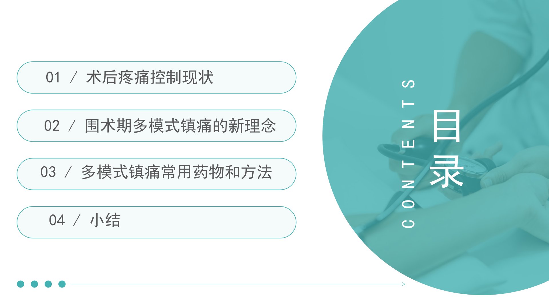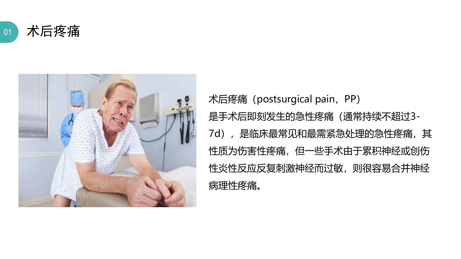 围术期多模式镇痛Multimodalperioperativeanalgesia术后疼痛术后疼痛(postsurgicalpain,PP)是手术后即刻发生的急性疼痛(通常持续不超过3-7d),是临床最常见和最需紧急处理的急性疼痛,其性质为伤害性疼痛,但一些手术由于累积神经或创伤性炎性反应反复刺激神经而过敏,则很容易合并神经病理性疼痛。术后疼痛对机体的不利影响长期不利影响短期不利影响2017版中国麻醉学指南与专家共识/中华医学会麻醉学分会编.北京:人民卫生出版社.2017年12月术后镇痛不足现象普遍存在(摘自网络)在美国77%患者经历术后疼痛;80%的患者为中-重度疼痛;超过50%的患者报告术后...