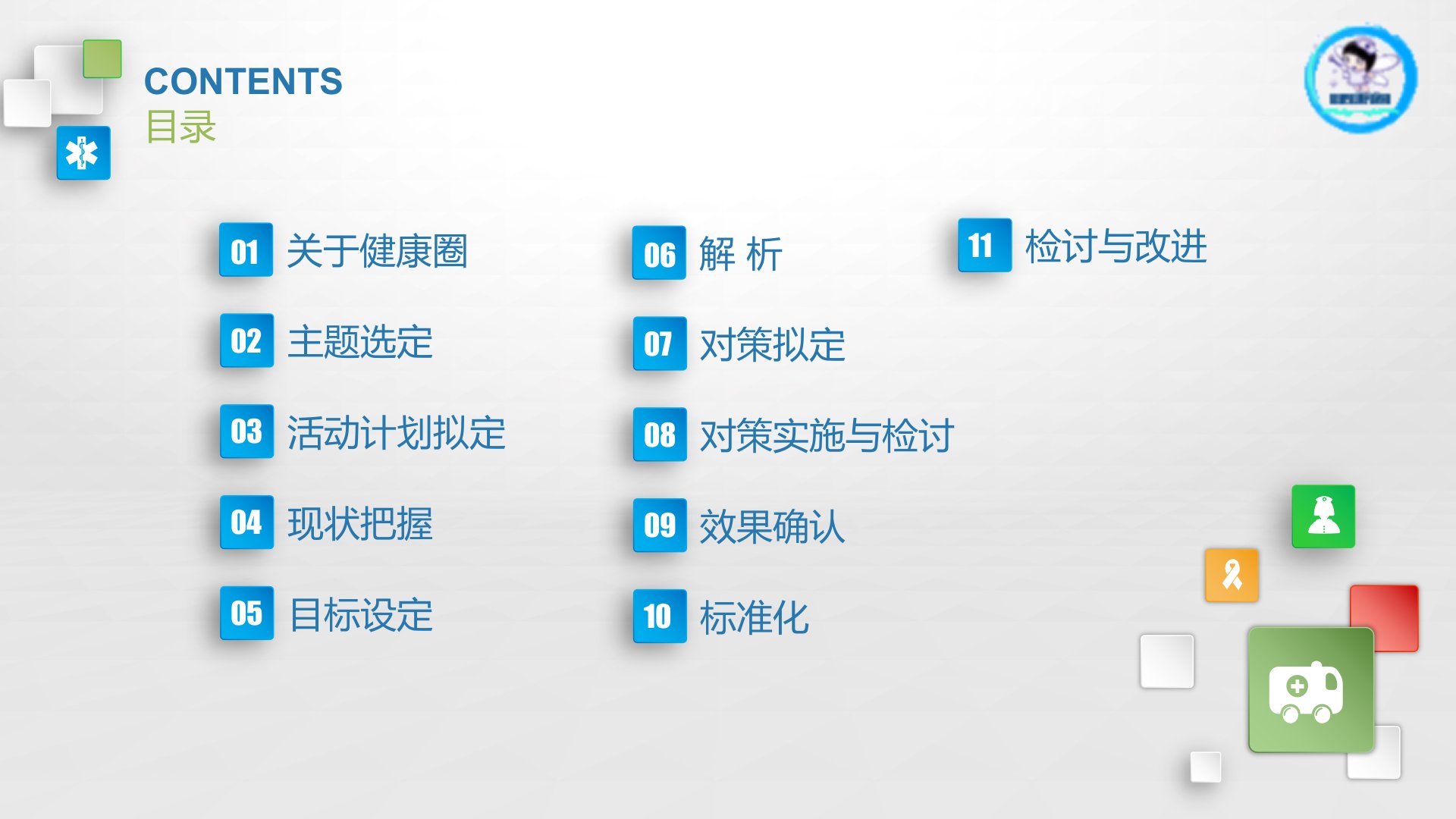 品管圈PPT模板内含鱼骨图柏拉图等专业医学PPT图表、图标框架完整内容真实获奖品管圈框架完整/所有文字可以修改/图片可以替换品管圈LOGOCONTENTS目录关于健康圈01主题选定02关于健康圈(圈名自定)这里可以添加医院名称和圈辉示范如图所以关于健康圈(圈名自定)关于健康圈(圈名自定)关于健康圈——圈名意义关于健康圈——圈名意义健康圈意指我们所有圈员的一种美好愿望,希望人人都能健康,更希望通过我们的努力,让更多的人变得越来越健康。主题选定——选题过程主题选定——关于主题此处添加解析说明主题选定——选题理由抗肿瘤药物能抑制恶性肿瘤细胞生长。化疗是目前治疗肿瘤患者的主要手段之一,但在化疗药物操作...