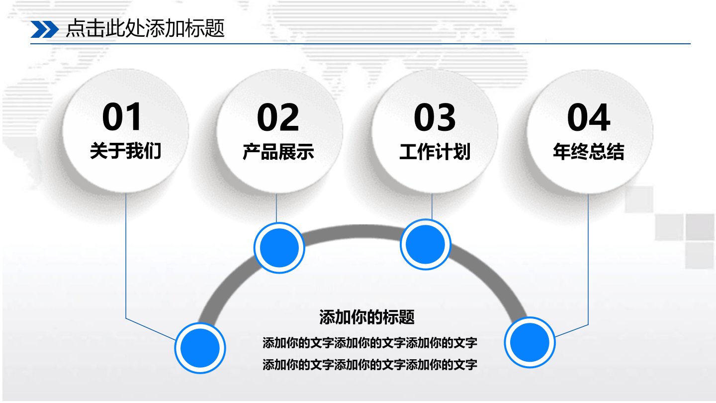LOGO医疗生物基因科技PPT模板新年计划公司介绍产品营销前言回顾这半年的工作,在取得成绩的同时,我们也找到了工作中的不足和问题,主要反映于xx及xxx的风格、定型还有待进一步探索,尤其是网上的公司产品库充分体现我们xxxxx和我们这个平台能为客户提供良好的商机和快捷方便的信息、导航的功能发挥。展望新的一年,我们将继续努力,力争各项工作更上一个新台阶。点击此处添加标题添加你的标题添加你的文字添加你的文字添加你的文字添加你的文字添加你的文字添加你的文字产品展示02工作计划03年终总结0401关于我们第一部分关于我们添加你的文字添加你的文字添加你的文字添加你的文字添加你的文字添加你的文字添加你的文...