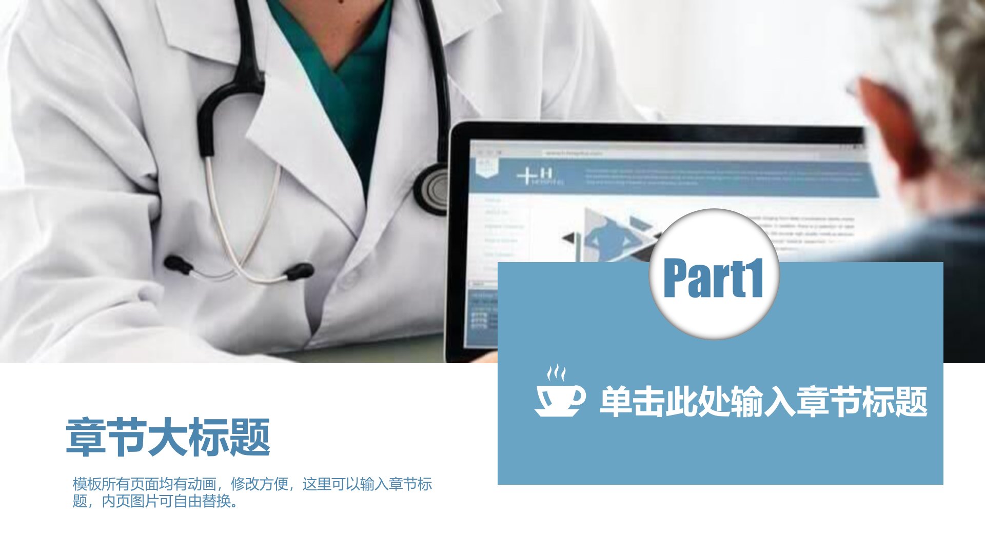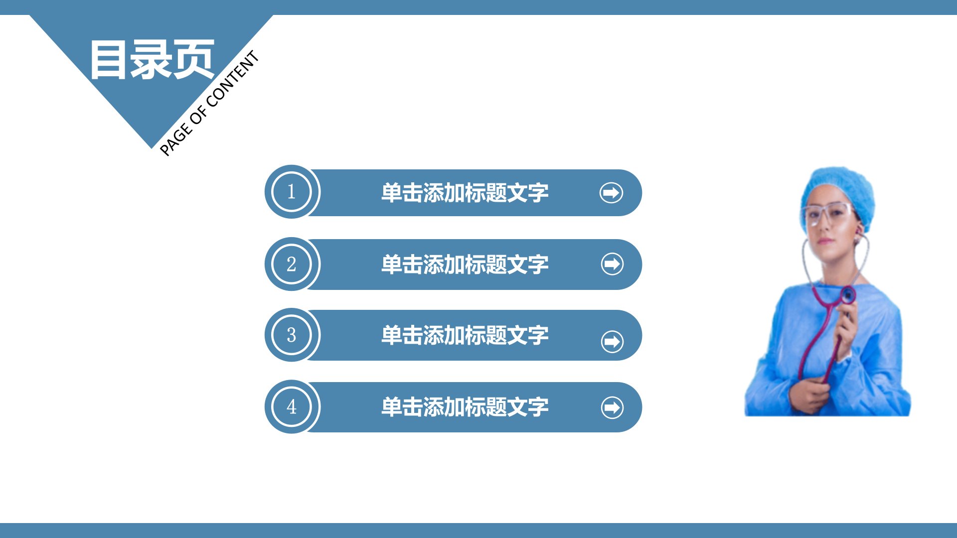 医学/医疗/医生PPT[医学医疗][医学研究][医疗手术][医院专用]目录页PAGEOFCONTENT章节大标题模板所有页面均有动画,修改方便,这里可以输入章节标题,内页图片可自由替换。单击此处添加标题此处添加详细文本描述,建议与标题相关并符合整体语言风格,语言描述尽量简洁生动。尽量将每页幻灯片的字数控制在200字以内,据统计每页幻灯片的最好控制在5分钟之内。单击此处添加标题从顾客的角度出发,从排版到设计制作,为您全新打造最佳的PPT演示文档。输入文字从顾客的角度出发,从排版到设计制作,为您全新打造最佳的PPT演示文档。输入文字从顾客的角度出发,从排版到设计制作,为您全新打造最佳的PPT演示文...