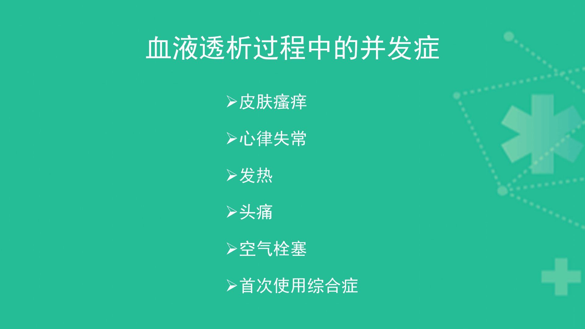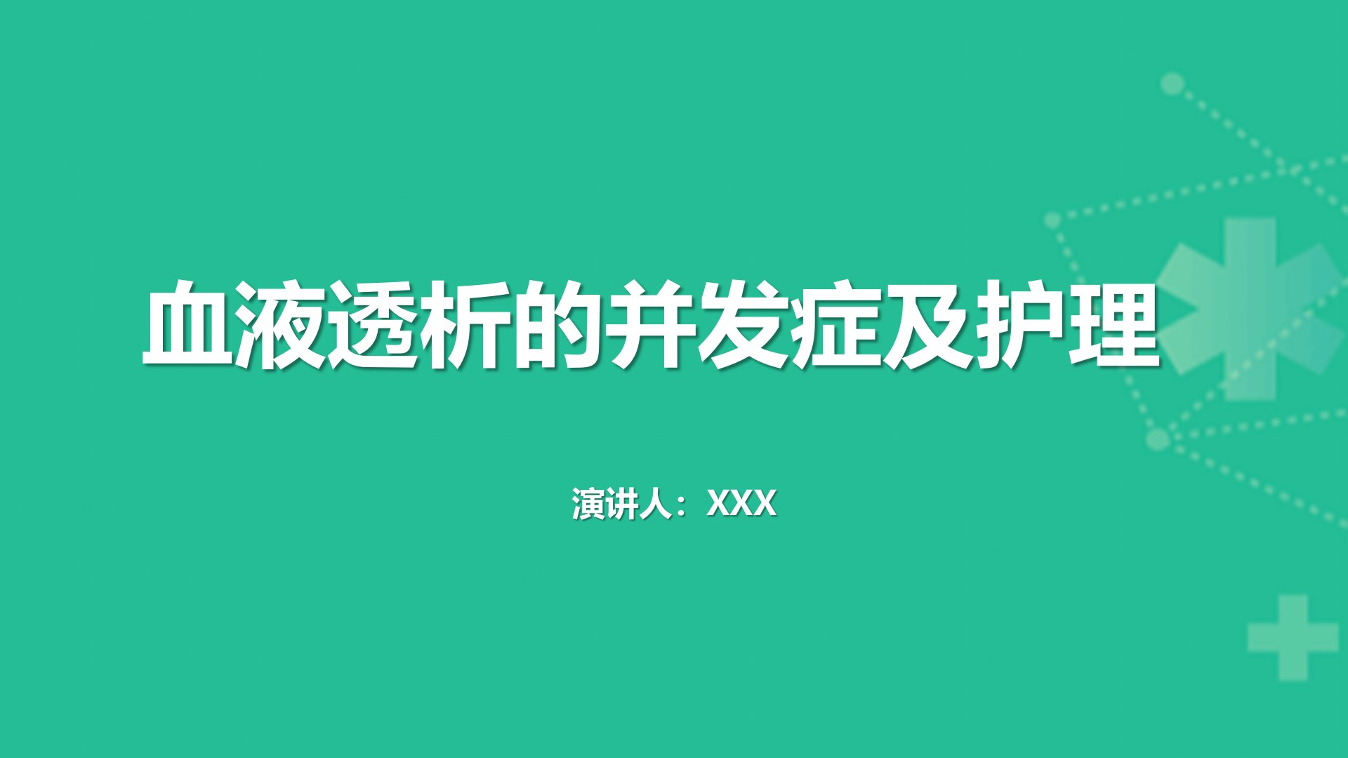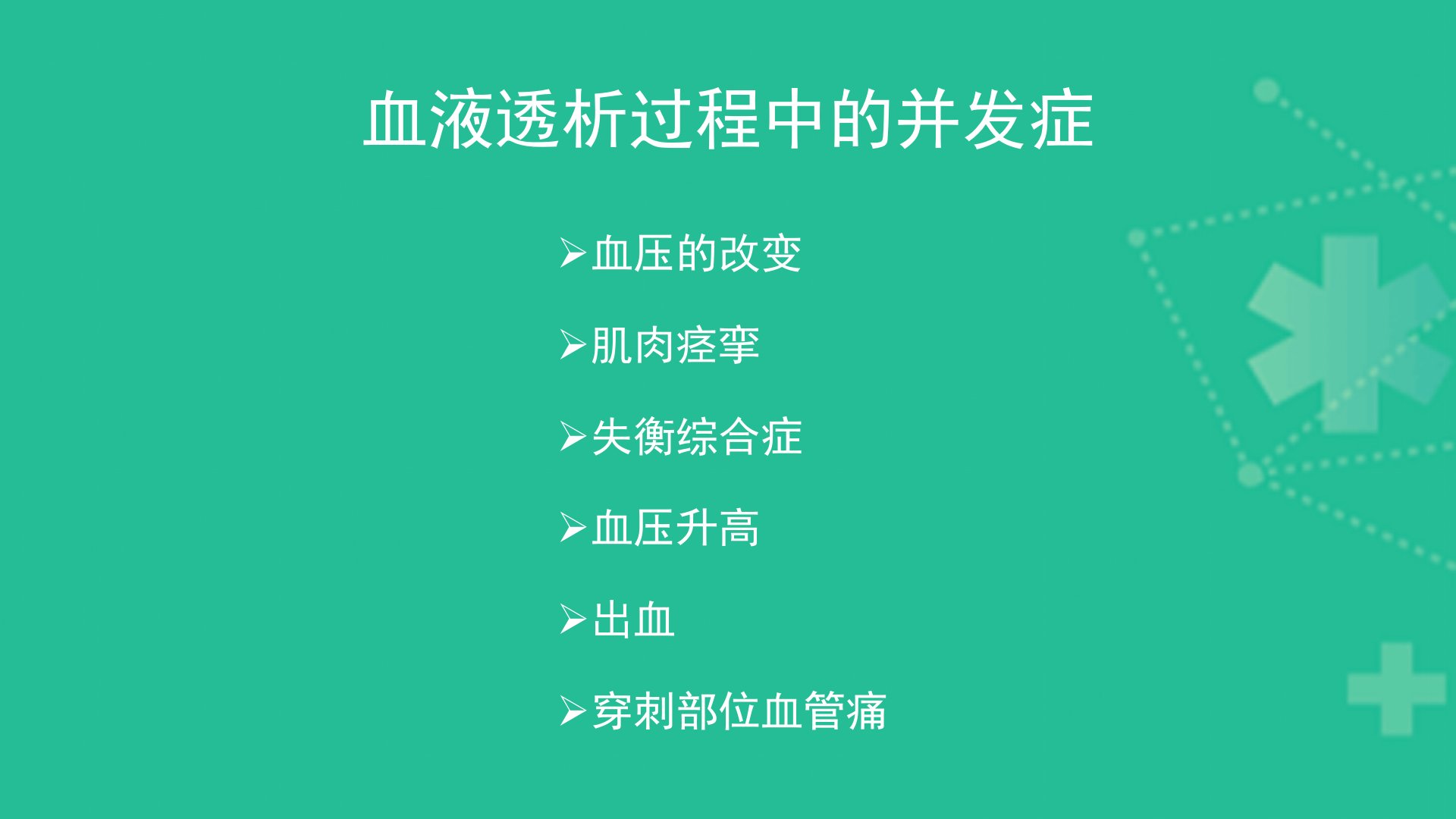 血液透析的并发症及护理演讲人:XXX血液透析过程中的并发症血压的改变肌肉痉挛失衡综合症血压升高出血穿刺部位血管痛血液透析过程中的并发症皮肤瘙痒心律失常发热头痛空气栓塞首次使用综合症(一)血压下降1.主要病因(1)不恰当的除水,如除水速度过快,除水量过多,或低于基础体重(干体重)以下的除水。(2)血管调节功能失常,特别是糖尿病及动脉硬化血管运动(即收缩舒张)功能失调,除水使血容量减少时,血管收缩障碍,引起血压下降。一、血压改变(3)心脏病,各种心脏病患者由于心功能不全或心律失常,引起机体有效血容量不足,在透析中更容易导致低血压。(4)全身状态不良,如发热、出汗、睡眠不足,机体消耗较大或饮食摄入不...
