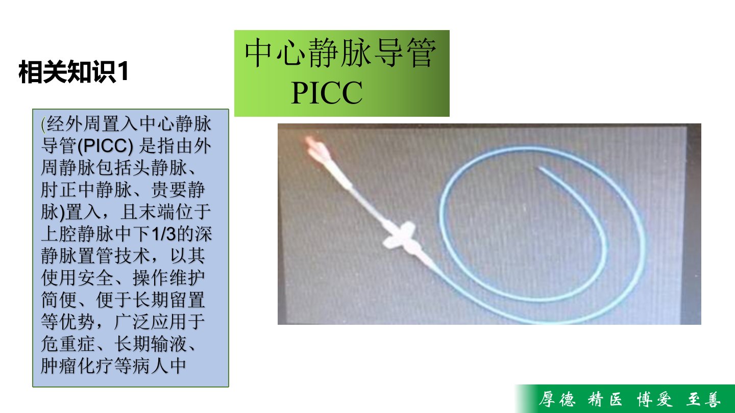 一例患儿PICC置管管口局部感染疑难病历讨论2020年7月8日目录CONTENTS相关知识1(经外周置入中心静脉导管(PICC)是指由外周静脉包括头静脉、肘正中静脉、贵要静脉)置入,且末端位于上腔静脉中下1/3的深静脉置管技术,以其使用安全、操作维护简便、便于长期留置等优势,广泛应用于危重症、长期输液、肿瘤化疗等病人中中心静脉导管PICC相关知识2但是,在临床使用过程中经常会因为各种并发症影响病人的使用,其中以导管堵塞发生率最高。PICC导管堵塞如果处理不及时,轻者可导致拔管,重者可危及病人生命。因此如何最大限度地减轻导管堵塞显得尤为重要,现将PICC堵管的原因及预防护理整理如下患者信息疾病诊...