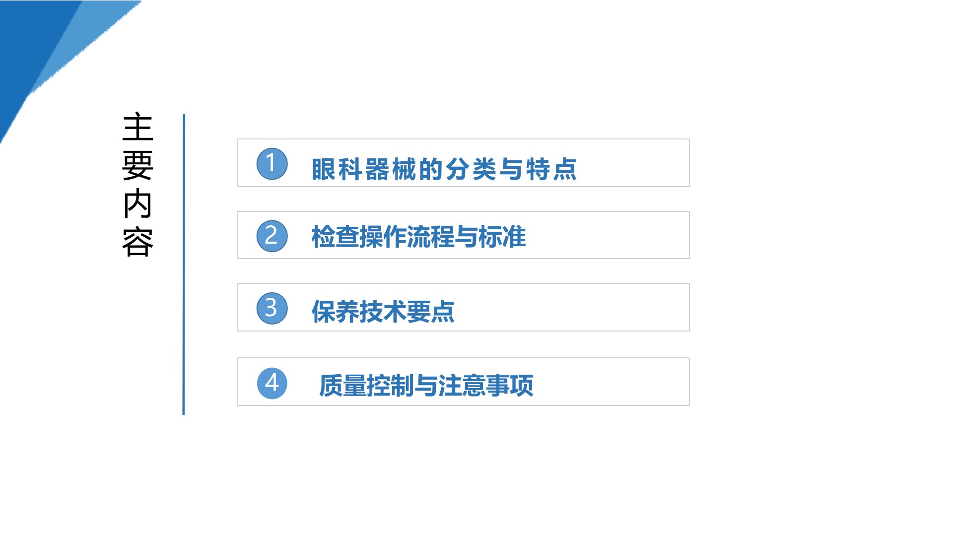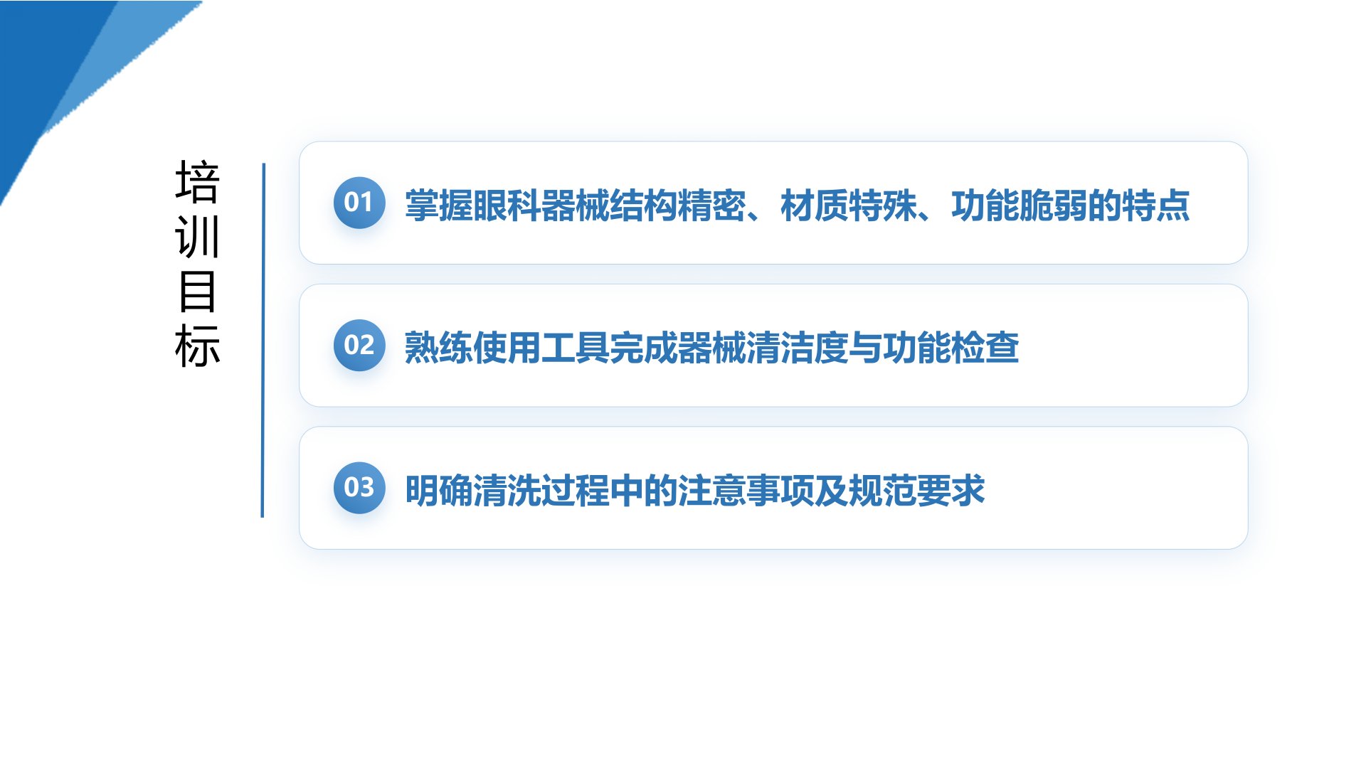 眼科器械的检查与保养保障诊疗安全,延长器械寿命主要内容123眼科器械的分类与特点检查操作流程与标准保养技术要点34质量控制与注意事项培训目标01掌握眼科器械结构精密、材质特殊、功能脆弱的特点02熟练使用工具完成器械清洁度与功能检查03明确清洗过程中的注意事项及规范要求01第一部分眼科器械的分类与特点眼科手术器械分类眼科手术器械分类眼科显微器械要求-显微剪为例眼科器械特点如显微镊、眼内剪等,头端精细(≤10mm),关节/管腔复杂。结构精密如超声乳化手柄、笛针等,部件易损,需防碰撞。功能脆弱多为不锈钢、钛合金或钻石材质,易腐蚀、磨损。材质特殊眼科器械特点青光眼手木器械包眼科器械特点显微眼科手术器械...