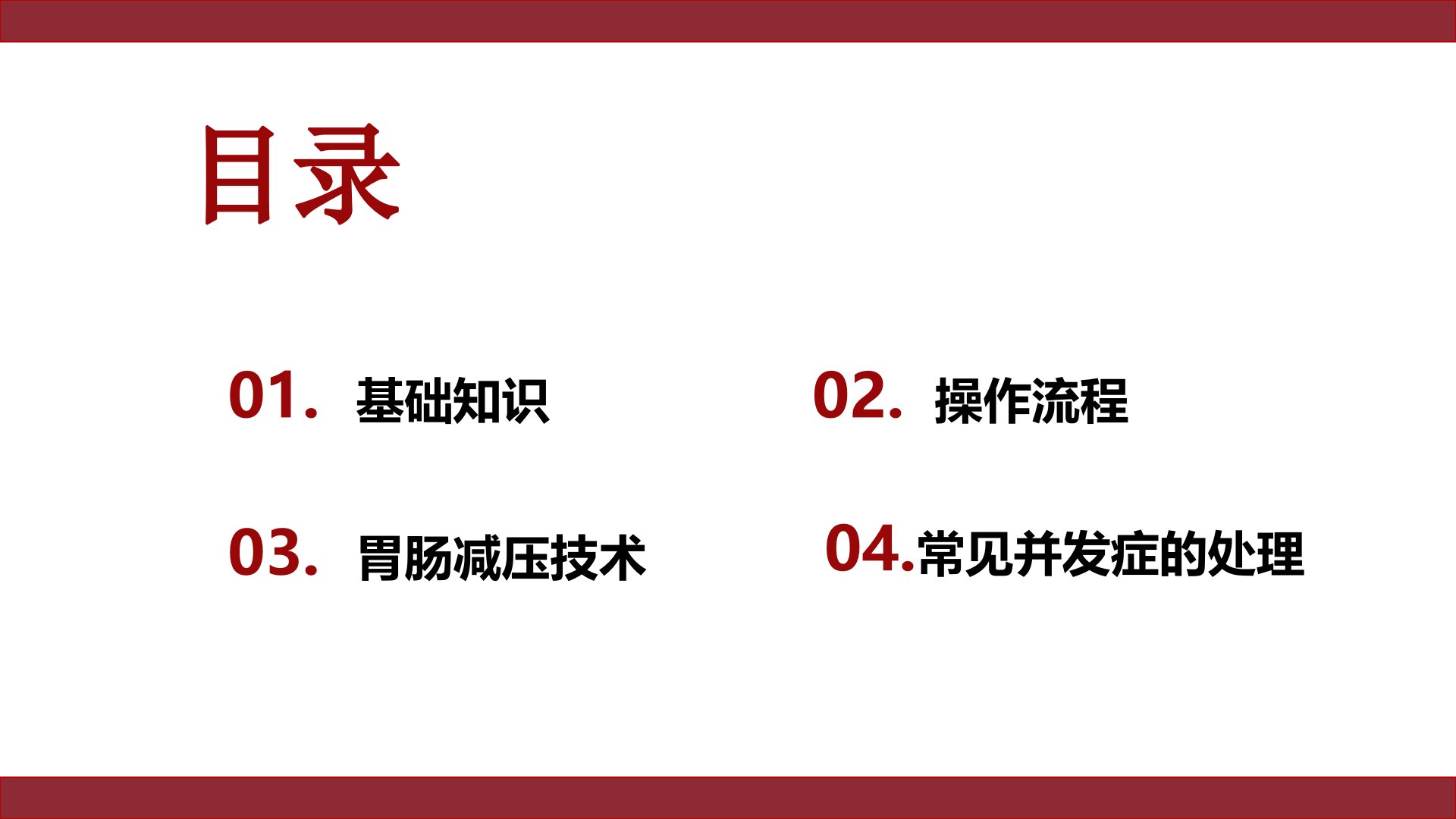 留置胃管→胃肠减压技术讲课人:日期:目录01.基础知识02.操作流程03.胃肠减压技术04.常见并发症的处理基础知识第一部分常用的一项医疗护理技术,是将胃管从一侧鼻腔或口腔置入胃内、以达到诊断、治疗、预防疾病的目的。胃管胃管置入术14通过对胃肠吸出物的判断,可观察病情变化和协助诊断。适应症急性胃扩张消化道穿孔或胃肠道有梗阻急腹症有明显胀气者或较大的腹部手术前等昏迷病人或不能经口进食者,如口腔疾患、口腔和咽喉手术后的病人不能张口的病人,如破伤风病人早产儿和病情危重的病人以及拒绝进食的病人禁忌症近期有出血倾向、上消化道出血史严重食管静脉曲张食管狭窄、颅底/面部骨折、严重的心肺功能不全者,支气管哮喘...