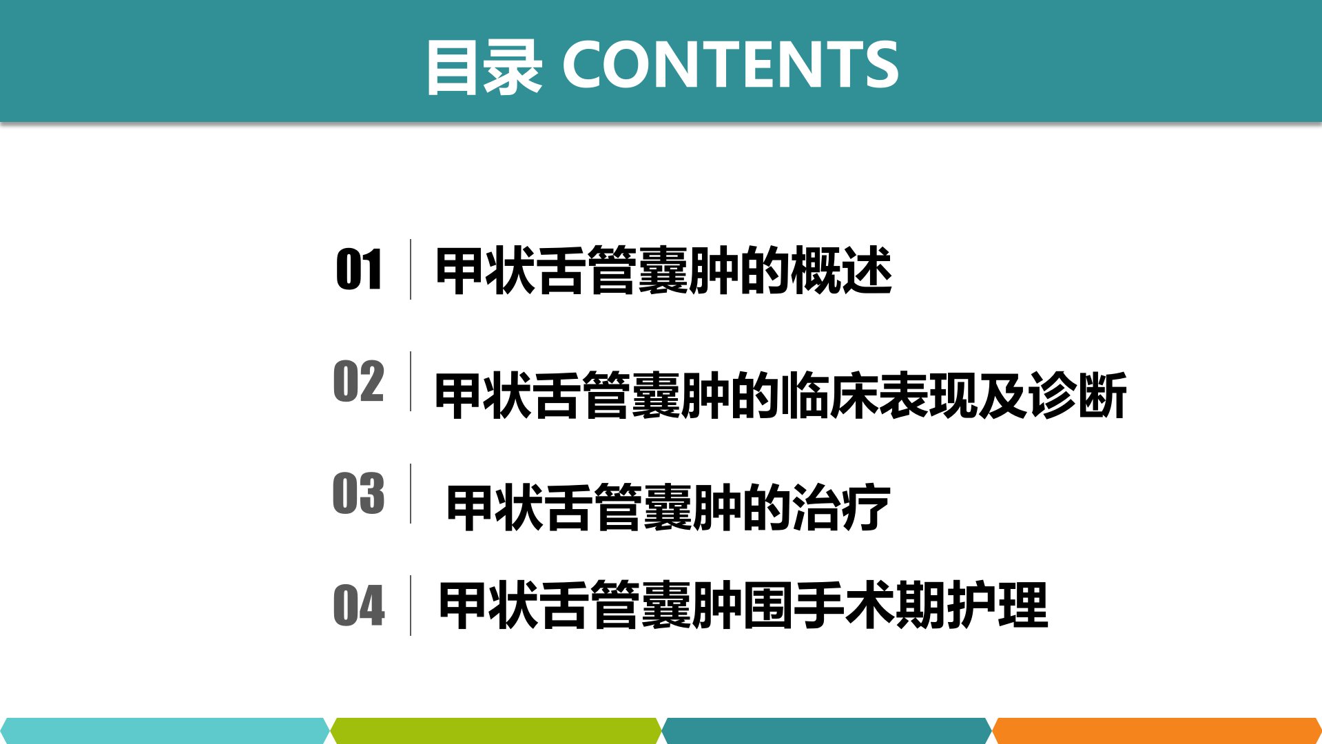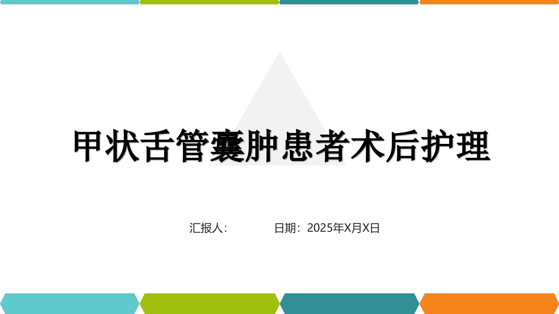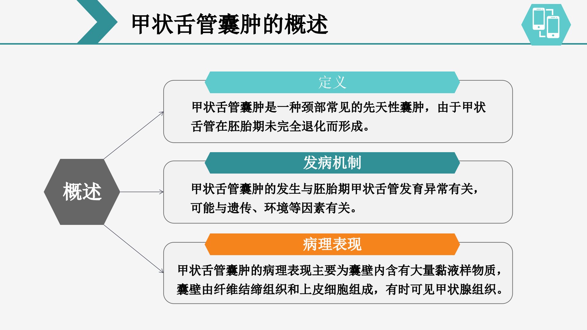 汇报人:日期:2025年X月X日甲状舌管囊肿患者术后护理01甲状舌管囊肿的概述020304目录CONTENTS甲状舌管囊肿围手术期护理甲状舌管囊肿的临床表现及诊断甲状舌管囊肿的治疗定义概述甲状舌管囊肿是一种颈部常见的先天性囊肿,由于甲状舌管在胚胎期未完全退化而形成。发病机制甲状舌管囊肿的发生与胚胎期甲状舌管发育异常有关,可能与遗传、环境等因素有关。病理表现甲状舌管囊肿的病理表现主要为囊壁内含有大量黏液样物质,囊壁由纤维结缔组织和上皮细胞组成,有时可见甲状腺组织。甲状舌管囊肿的概述临床表现:通过颈部超声、CT或MRI等影像学检查,可确定囊肿的大小、位置及与周围组织的关系,通常可作出诊断。鉴别诊断...